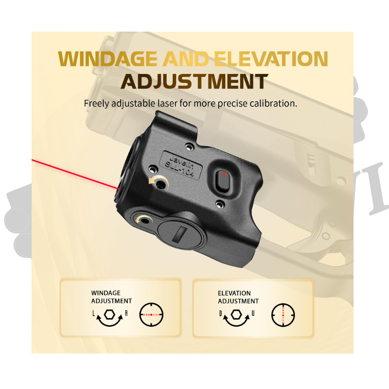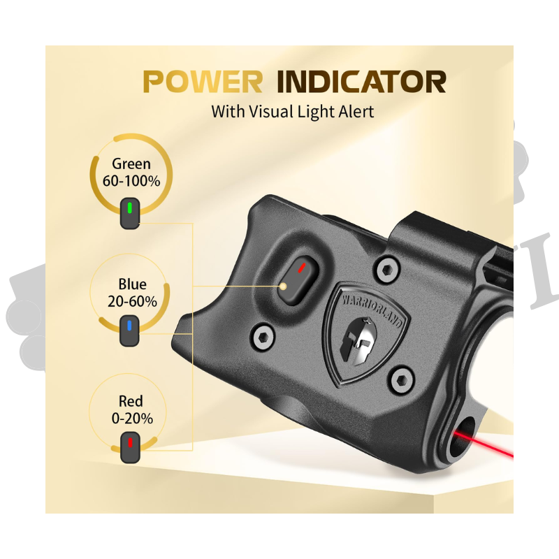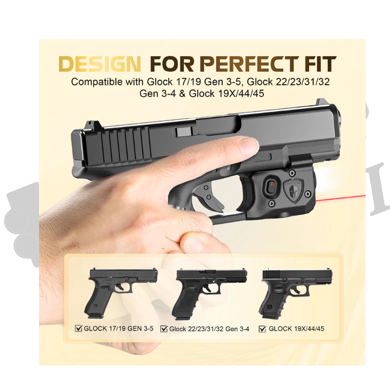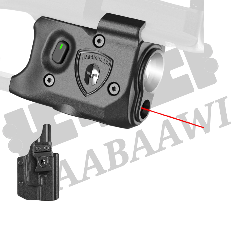مصباح ليزر يُركَّب على الزناد WARRIORLAND SLL-104-H مع حافظة إخفاء داخل الخصر (IWB) مخصّصة، متوافق مع Glock 17/19 الجيل 3–5، وGlock 22/23/31/32 الجيل 3–4، وGlock 19X/44/45. غير متوافق مع Glock 22/23/31/32 الجيل 5.