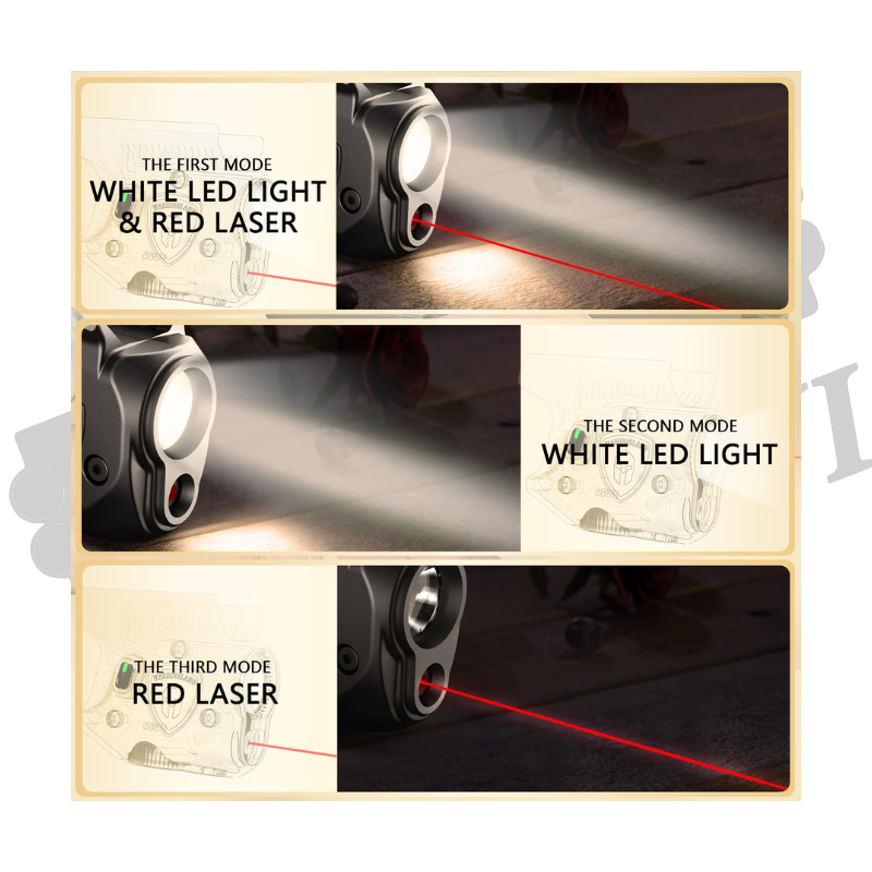أوضاع التشغيل: ليزر فقط، ضوء LED فقط، أو كليهما معًا، مع وضع وميض LED اختياري يتم تفعيله بالضغط المزدوج على أي من مفاتيح الجانبين.