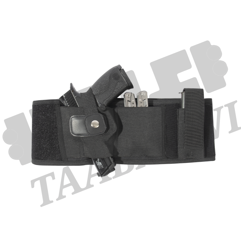 -تتميز حافظة المسدس بشريط تثبيت (Loop Panel) يمتد على كامل الجهة الأمامية لإمكانية ضبط المقاس حسب الحاجة.